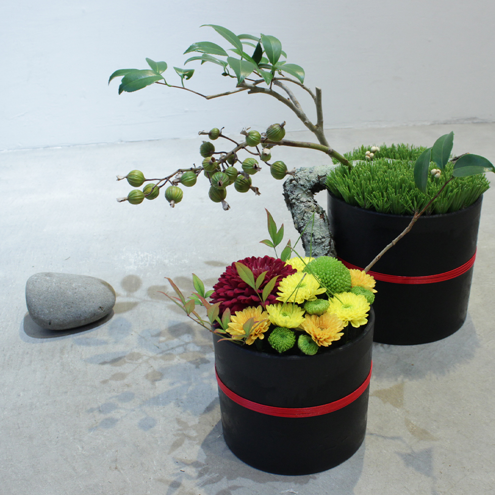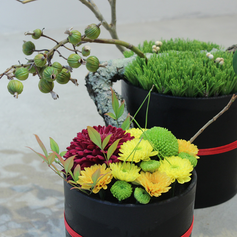 金のブロックをアクセントにの加え、ブラックエコの質感を活かし、パラレルとグルーピンクデザイン活け方に調和をもたせています。
